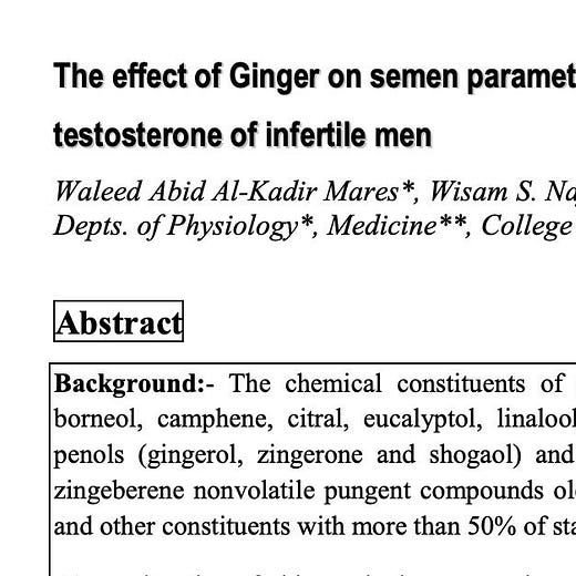 It’s a fun and strange literature. First, I notice that a lot of the work seems to be on rats, and a 2018 piece notes that “the effect of ginger on testosterone is not yet confirmed in humans.” Are rats a good model organism for human infertility? Who knows? Second, for some reason, every piece I read was done by researchers at universities in the Middle East. Is ginger a widely touted folk remedy for infertility there? Is it to the west’s discredit that we’re not conducting large-scale RCTs on this popular and eminently testable theory? Will there eventually be a MAHA university where they test this stuff rigorously? These papers are a crab emerging from a dark pool. What else swims in the loomy gloom?
